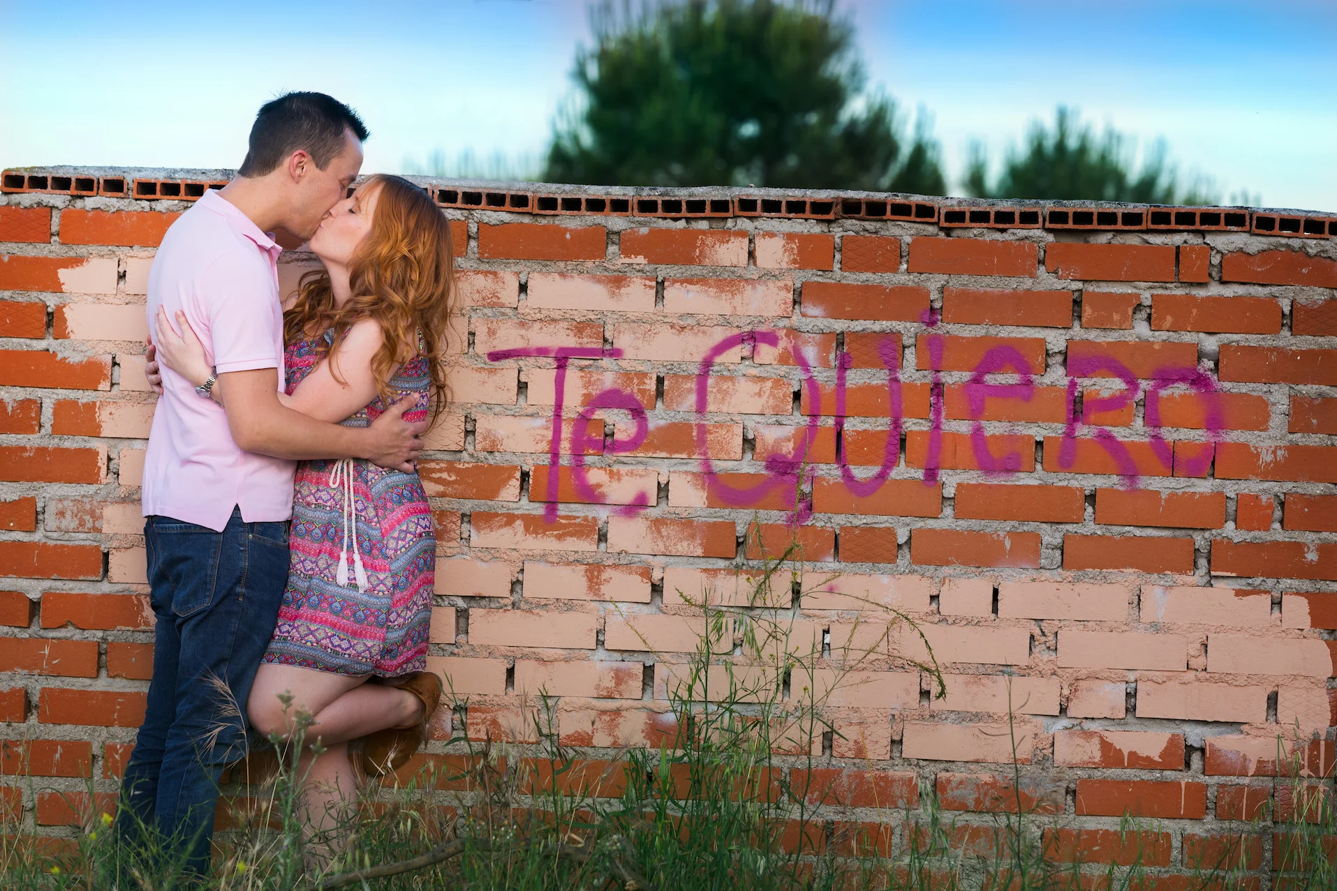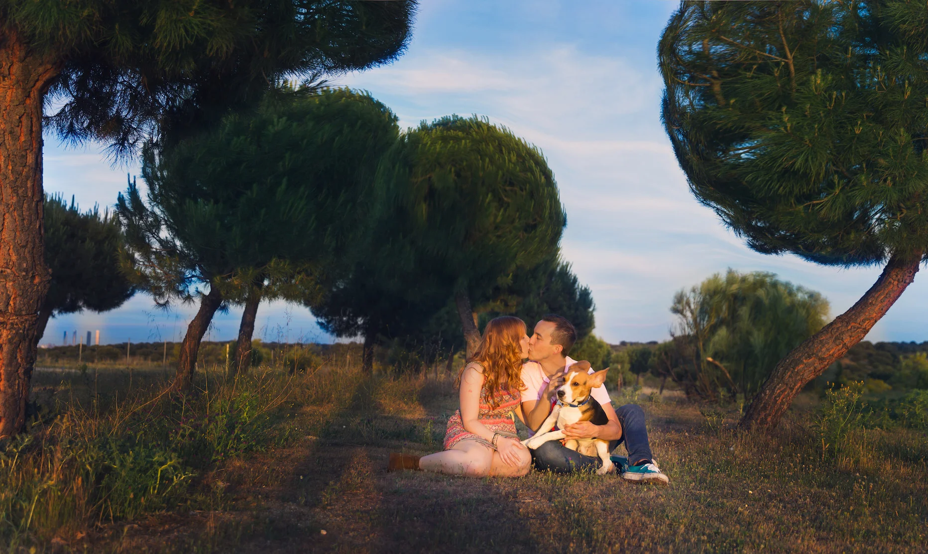 By 7PM, I was hustling back to my car to make sure I'd make my next appointment on time. I took the A-6 highway to a Las Rozas neighborhood called "La Marazuela." I chose this location because my next clients, a soon-to-be-married couple doing a "preboda" shoot, would be bringing their puppy with them and I wanted an open space with as few passersby as possible. We planned for sunset, but the sun sets so late in Madrid during late May (9:45PM) that it ended up being more of a late afternoon look with the sun still hitting us pretty hard. Here are some of my favorite shots: